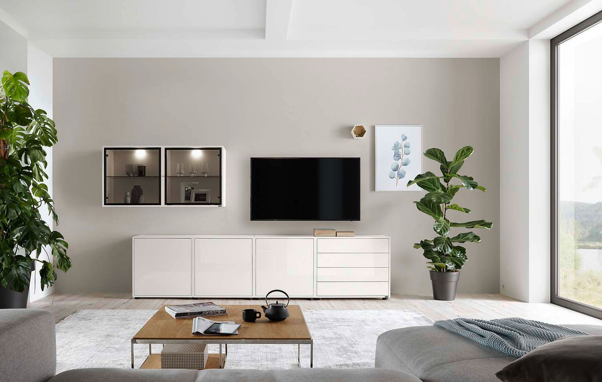 Светлая и легкая коллекция мебели для гостиных Gallery M Air150. Разнообразные элементы в белом глянцевом лаке в сочетании с модными металлическими акцентами в стиле лофт.